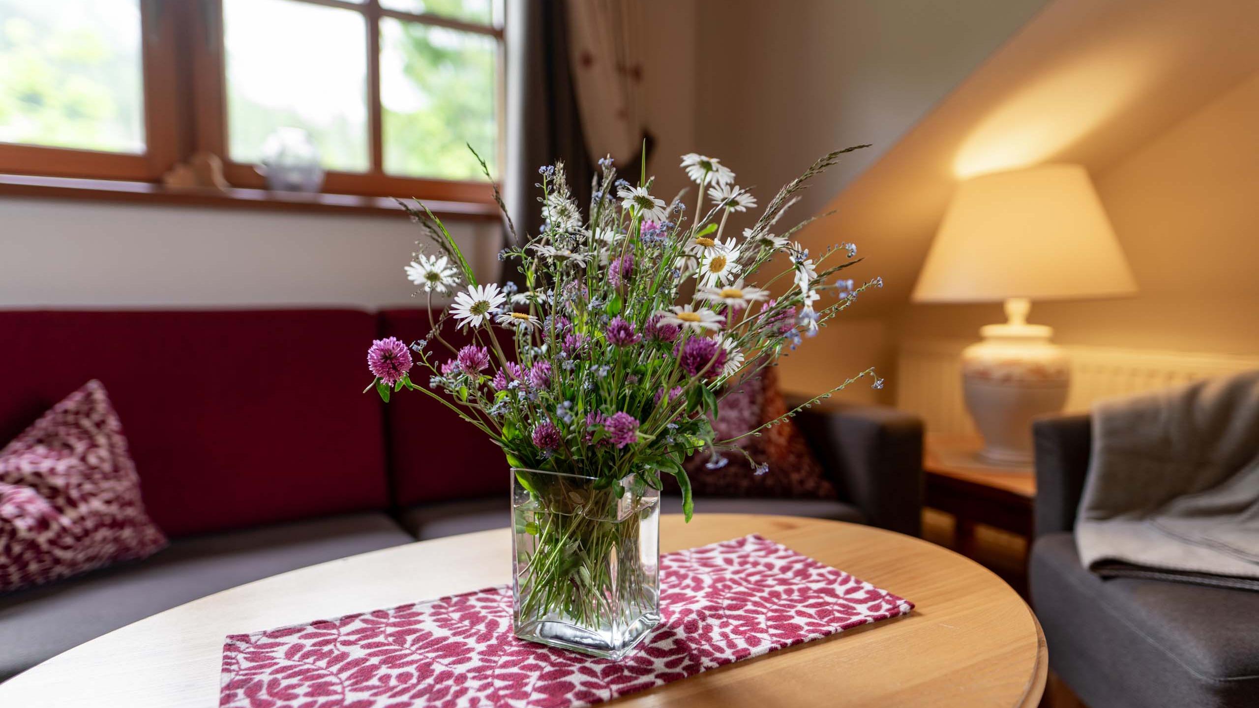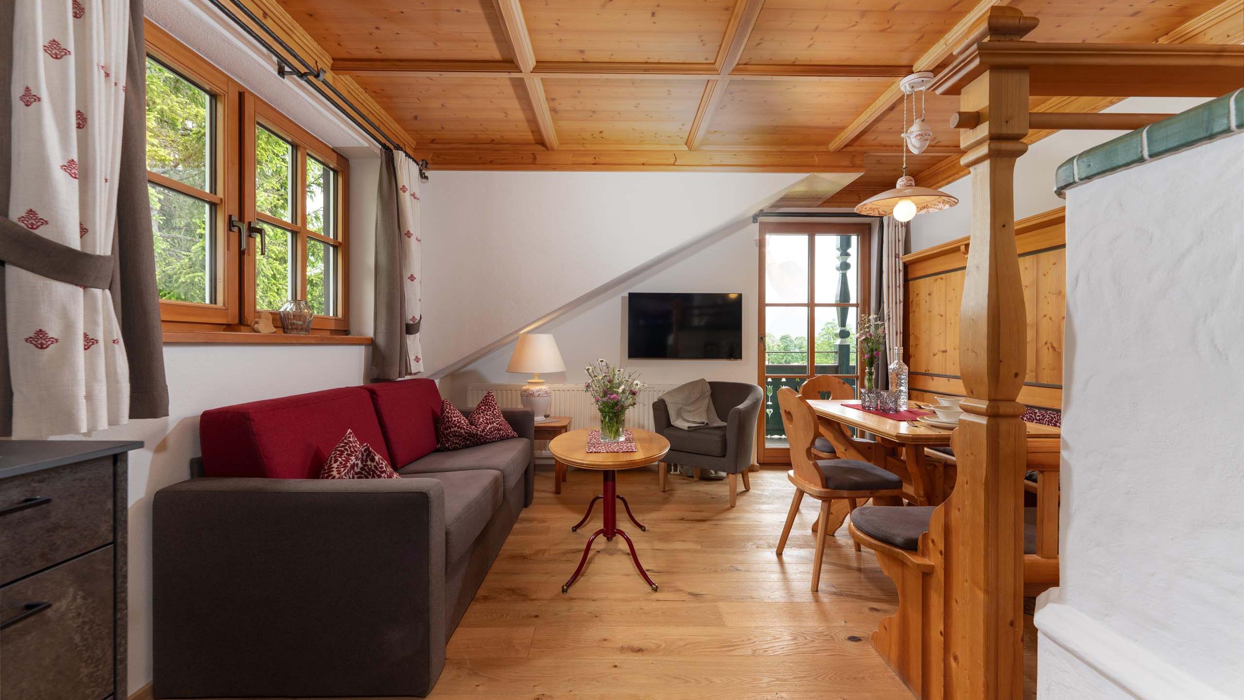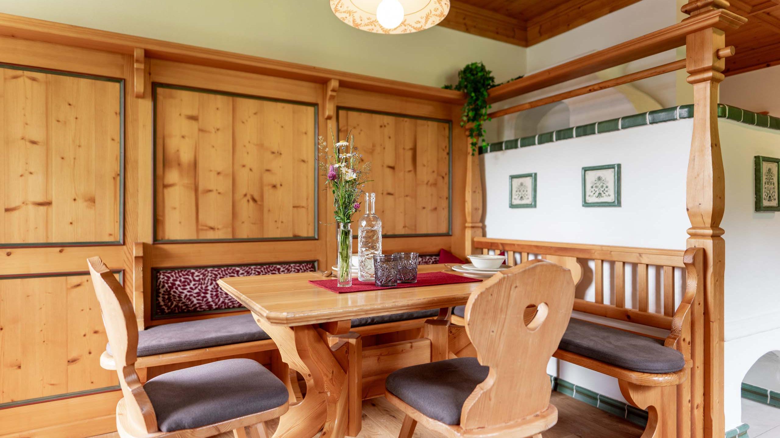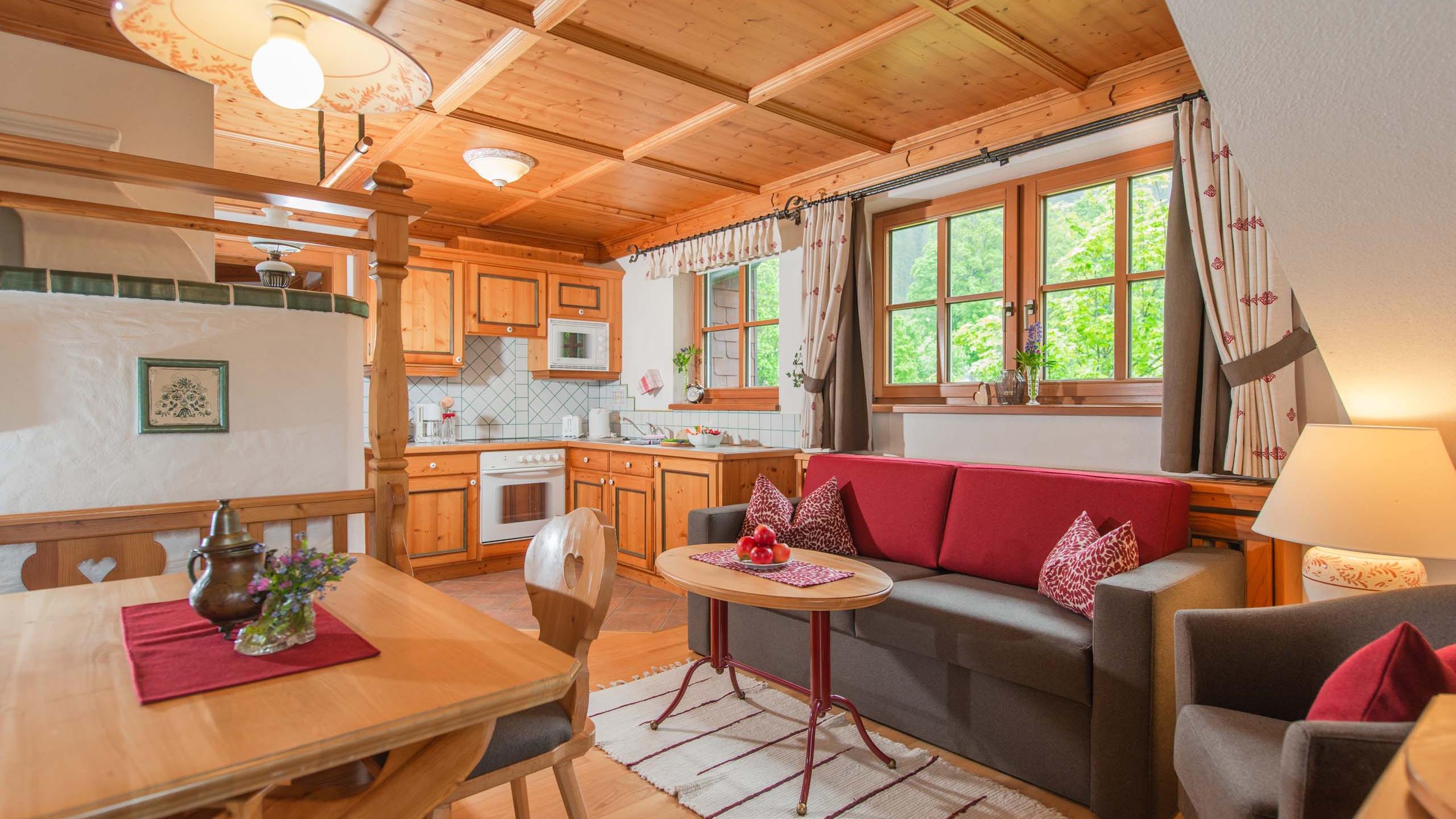- 1 living room with automatically heated tiled stove
